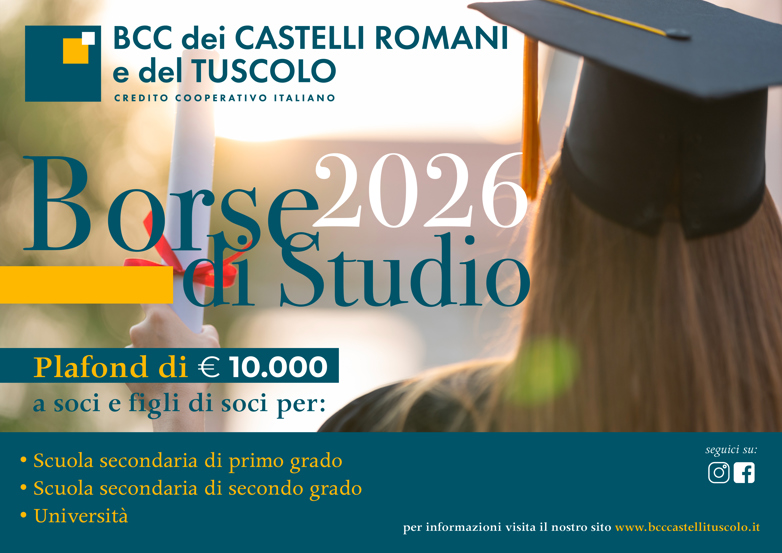 Per il 2026 la Banca di Credito Cooperativo dei Castelli Romani e del Tuscolo ha confermato l’assegnazione di BORSE DI STUDIO per soci o figli di soci che nel corso dell'anno 2025 abbiano conseguito una laurea, un diploma di secondo grado di scuola secondaria o un diploma di primo grado di scuola secondaria.